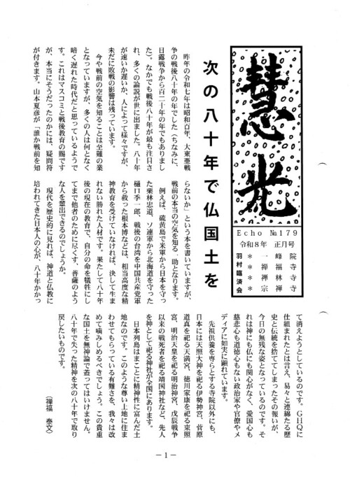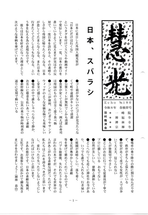 「慧光」は、東京都羽村市の臨済宗のお寺(一峰院、禅福寺、禅林寺、宗禅寺)で設立された「羽村臨済会」の季刊誌です。
