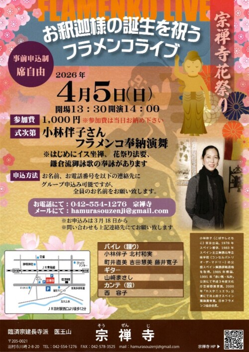 ※ フラメンコライブ前にお釈迦様の誕生を祝した法要とイス坐禅を行います。